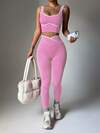 Sovereign Charm 3pcs Women's Sports Suit Set, Includes Long Sleeve T-Shirt, Adjustable Strap Top, And High Waist Flared Pants, Suitable For Daily Casual Wear, Running, Yoga, Gym, Tennis, All Seasons Flared Leggings Set Pink Sport Set