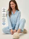 Loomlin Cotton Women 2 Pcs Contrast Colour Star Pattern Button Front Homewear Pajama Set For Ladies Soft Pajamas Set Sleeping Pajamas For Women Lounge Sets For Women Sleepwear Light Blue Pajama Set Light Blue Pj Set