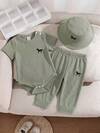SHEIN Playful Pals 3pcs/Set Infant Baby Boy Casual Black Horse Pattern Grey Open Shoulder Romper, Matching Elastic Waist Pants And Hat, 3M-12M