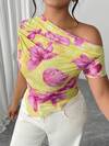 Chikora Plus Size Fashion Printed Ruffle Trim Tie Tops, Women's Casual Tops, Women's Elegant Tops, Women's Tops, Summer Blouses, Vacation, Going Out Women's Tops, Elegant