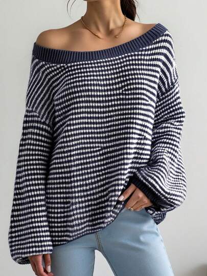 SHEIN Leap Crew Teen Girls Colorblock Randigt Blommönster Off Shoulder Crewneck tröja - Blått och Vitt - Visa 1