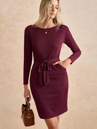 Écloséra European & American Casual Everyday Versatile Long Sleeve Belted Loose Knit Elastic Black Dress For Women, Autumn/Winter - Burgundy - View 1