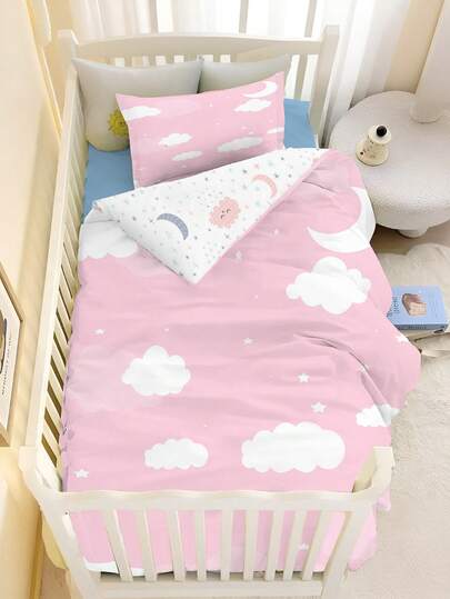 1/2pcs Set Reversible Cute Pink Cloud & Star Print Baby Bedding Set - Soft Hypoallergenic Baby Duvet Cover & Fitted Sheet Set - Multicolor - View 3