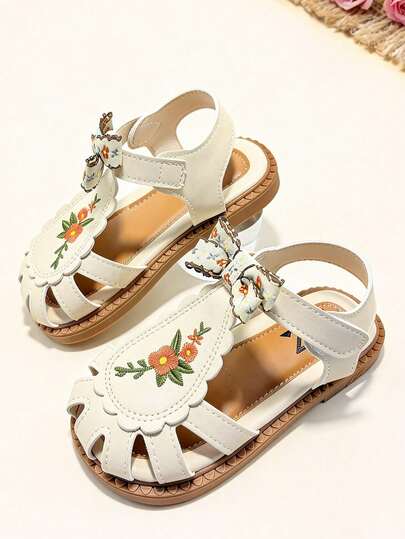 1 Pair Fashion Children's Sandals, Beige Girls' Sandals, Butterfly Embroidery Decor, Hook And Loop Design, Soft Non-Slip Sole, Suitable For Banquets, Gatherings, Parties, Weddings, Vacations