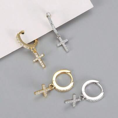1 Pair Silver/Gold Plated White Cubic Zirconia Cross Pendant Earrings, Gift