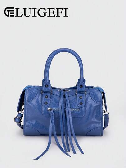 1 Pc Blue Splicing Rivets Inlaid Metal Zip Tassel Zip Decoration Retro PU Material Double Handles Adjustable Long Shoulder Strap Design Zip Closure Fashion Retro Sweet Cool Style Biker Bag Y2K Punk Style Square Bag Ladies Tote Bag Casual Quiet Luxury Style Ladies Slant Shoulder Bag Suitable For Daily Commuting Work Shopping Shopping And Other Use - Blue - View 1