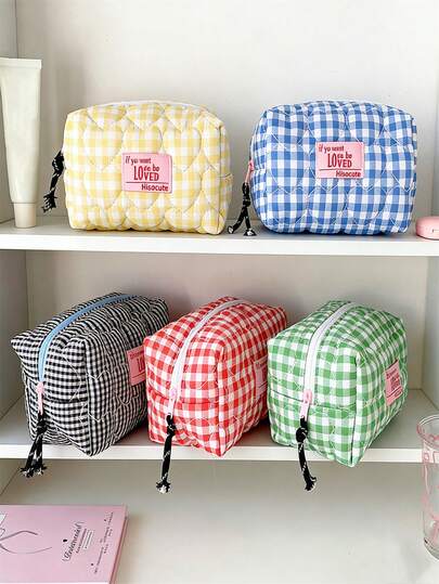 1 Pc Women Quilted Heart Pattern Cosmetic Bag Cute Beautiful Plaid Travel Washing Bag Female Cosmetic Storage Bag - Multicolor - View 14