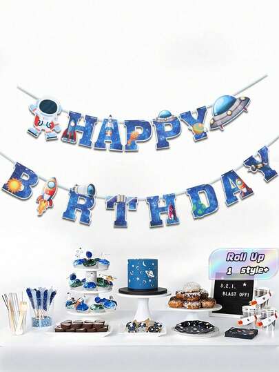 1 Set Space Astronaut Happy Birthday Roll Up Banner Stand With Astronaut Planet Rocket Pattern Birthday Party Backdrop Hanging Decoration Festival Celebration Wall Background Decor Must Have