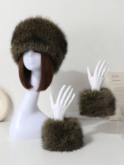 1 set dam enfärgad fluffig hinkhatt, armvärmare, handledsvärmare, varm och vindtät öronlappsmössa, stickad mössa, söt avslappnad elegant retro streetstyle all-match slösmössa, lämplig för utomhusbruk, skidåkning, cykling, resor, fest, daglig användning alla hjärtans dag-present - Beige - Visa 1