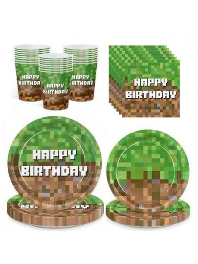 10/20/50pcs,Pixel Party Plates,Cups And Napkins Mining Pixel Happy Birthday Party Supplies Video Game Disposable Paper Tableware Set For Baby Shower Video Game Pixelated Themed Birthday Decoration - Multicolor - View 1