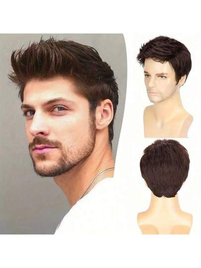 10 Inch Brown & Black Short Textured Synthetic Wig For Men, Versatile For Everyday Wear And Halloween Costumes, European & American Style Short Business Men's Wig, Natural Fluffy Short Hair High Temperature Fiber - Multicolor - View 1