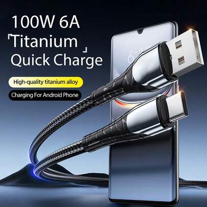 100W 6A Fast Charging Data Cable, Titanium Alloy, Compatible With Samsung Galaxy S25 S24, Honor, 14, Redmi, OPPO, OnePlus, VIVO And Other Android Phones, USB-C Charging, High-Speed Data Transfer, Nylon Braided - Black - View 1