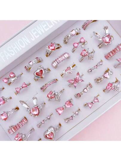 10pcs/Set Luxury Glass Inlaid Alloy Women's Ring Set, Cute & Elegant Bow, Heart Mixed Styles, Openable Rings For Party, Wedding, Daily Wear, Fashion Jewelry, Best Gift, Random Assortment - 10 Random Glass Rings - View 1