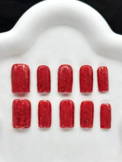 10pcs Square Nails Handmade Nail Tips Y2K Baddie Style, Nude & Red Color For Valentine's Day Party And Musical Festival, Suitable For Women & Girls, Includes Tools, Great Gift For Laddies Nails - Multicolor - View 1