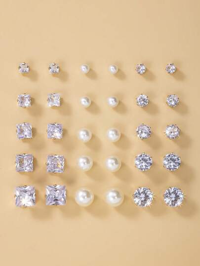 15 Pairs Elegant Rhinestone & Faux Pearl Earrings Set, Versatile Daily Wear Earring Studs For Women - White - View 1