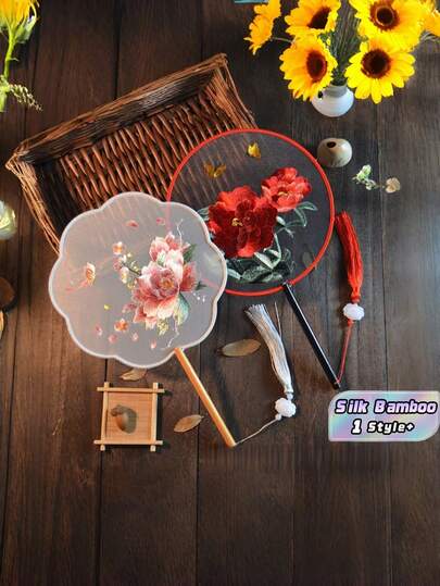 1PC Silk Bamboo Double Sided Suzhou Embroidery Floral Round Fan Classical Dance Hanfu Wedding Home Decor Party Chinese Antique