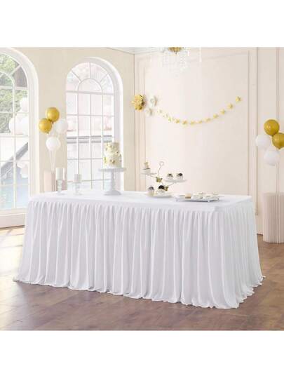 1PC White Polyester Table Skirt (For Rectangular Table), Wrinkle-Resistant Pleated Ruffled Tablecloth, Suitable For Birthday Parties, Banquets And Weddings - White - View 1