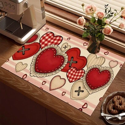 6. 1pc Valentine's Day Red Heart Print Absorbent Mat/Drying Mat For Coffee Maker, Dishes - Polyester Absorbent Desktop Protective Mat With Rubber Anti-Slip Pad, For Kitchen Counter Decor, Home Bar And Dining Table