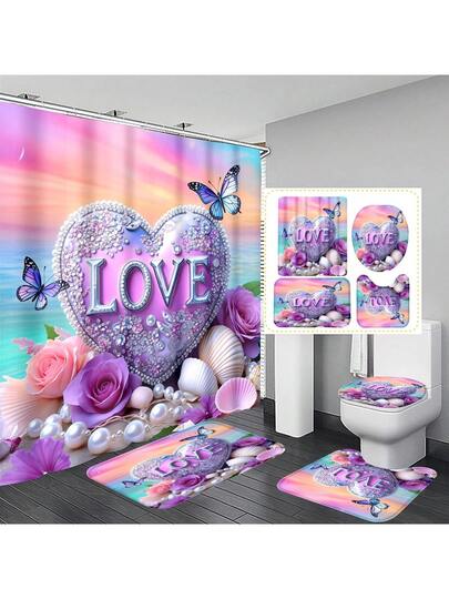 1pc/3pcs/4pcs Valentine's Day Diamond Purple Heart Butterfly Shell Multifunctional Bathroom Decor Shower Curtain Set, Free 12 Hooks Included, Elegant Holiday Atmosphere, Bathroom Mat, U-Shaped Floor Mat And Round Toilet Mat, Suitable For All Scenarios Bathroom Set - Multicolor - View 1