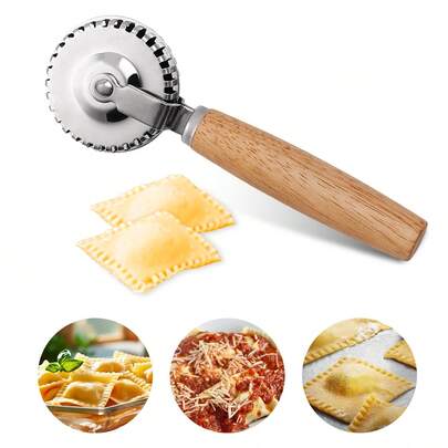 1pc 430 Stainless Steel Italian Dumpling Embossing Cutter, Rubber Wood Handle Baking Rolling Wheel Knife, Multi-Functional Pastry Crimper, Home Baking Tool, Suitable For Pie, Wonton Skin, Pizza And Cookie Molds, Kitchen Essential, Pasta Roller, Baking Accessories, DIY Fluted Edge Cutting Baking Tool, Non-Stick Easy To Clean Kitchenware, Suitable For Eid Al-Fitr, Easter, Back To School Season - View 1