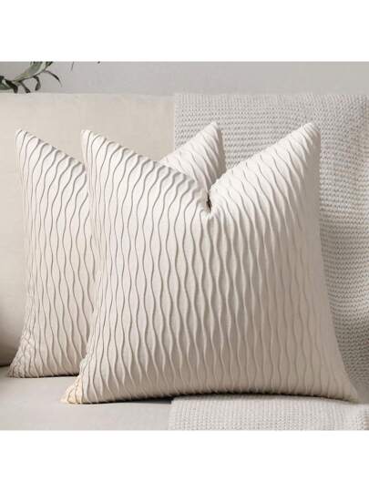 1pc Bohemian Style Striped Pillow Case In White, Soft Velvet Solid Decorative Square Cushion Cover For Sofa, Bed, Car, Home Decor, Party, Four Seasons Universal(insert Not Included) - Beige - View 1