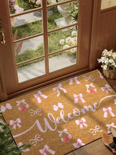 1pc Bowknot Cherry Print Welcome Doormat, Simple Style Indoor Outdoor Non-Slip Mat, Machine Washable Polyester Fiber, Suitable For Kitchen, Dining Room, Hallway, Bathroom, Bedroom, Outdoor, Entryway, Home & Room Decor, All Seasons - Pink - View 1