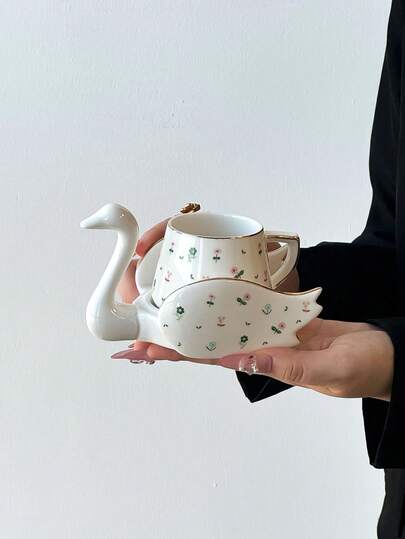 1pc Ceramic Creative Gold-Plated Swan Coffee Cup & Saucer Set, Suitable For Home Kitchen, Dining Room, Living Room, Outdoor, Wedding, Party, Gift, Birthday, Christmas, Souvenir - Multicolor - View 1