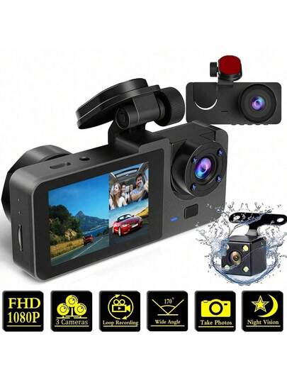 1pc,Dash Cam Front And Rear And Inside, 3-Lens Dash Camera For Cars, 1080P FHD DVR Car Dashboard Camera With Loop Recording,Car Camera,2 Inch Display,Not Included SD Card - Black - View 1