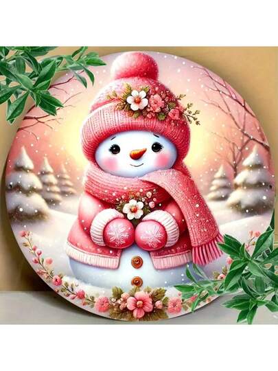 1pc Flat 2D Printed Metal Sign, Snowman Christmas Theme - Iron Holiday Wall Decor Plaque For Home And Office - Circular Wreath Sign For Holiday Wall Decor, Random Hole Positions - Multicolor - View 1
