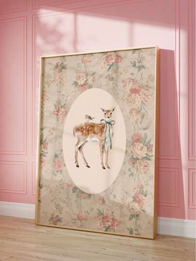 1pc Frameless Deer With Bird On Back And Green Ribbon Art Print, Whimsical Cottagecore Soft Floral Background, Vintage Animal Poster For Living Room, Bedroom, Dorm, Room Decor, Back To School, Funky Posters, Gift
