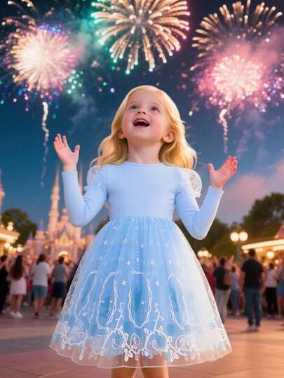 1pc Girls Princess Style Mesh Tulle Princess Dress, Round Neck Puff Sleeve, Suitable For Outdoor, Party, Holiday, Autumn/Winter - Blue - View 9