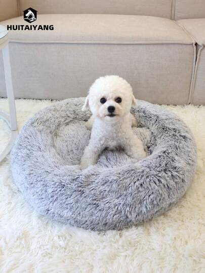1pc HUITAIYANG Plush Solid Color Non-Detachable Pet Round Nest, Soft & Comfortable, Machine Washable Pet Bed Suitable For Cats & Small/Medium Dogs, For Daily Use & Outdoor Carrying - Light Grey - View 1