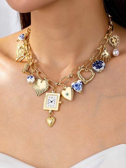 1pc Handmade Multi-Pendant Necklace, Faux Buckle Decor, Ceramic Heart Bead Pendant, Cross Cowboy Boot Pendant, Random Shapes And Colors, Valentine's Day Gift - Gold - View 1