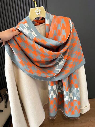 1pc Ladies' Houndstooth Jacquard Imitation Cashmere Winter Fashionable Multi-purpose Poncho Outerwear Thick Warm Scarf Suitable For Daily Wear - Orange - View 1