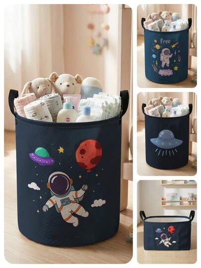 1pc Large Capacity Foldable Round Storage Basket, Cartoon Universe Pattern Printed, Durable, With Handle, Multi-Purpose Storage Bin For Nursery, Diaper, Clothes, Baby Supplies