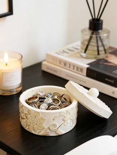 1pc Nordic Style Handcrafted Floral Relief Jewelry Box, Retro Home Resin Jewelry Box, Creative Desktop/Bedroom Jewelry Storage Box, Elegant Vanity Decor