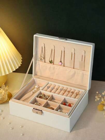 1 st PU-läder smyckeskrin för kvinnor, 2-lagers smyckesdisplay förvaringshållare för halsband örhängen armband ringar - alla hjärtans dag-present - Vitt - Visa 1