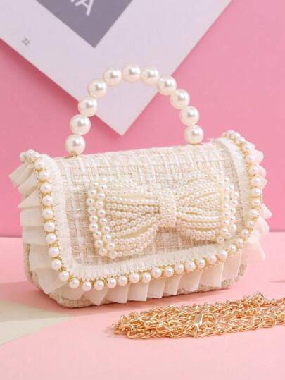 1pc Plaid Solid Color Plus Size Pearl Bow Ruffle Decor PU Chain Strap Snap Closure Fashion Handbag Crossbody Bag Cute Shoulder Tote Coin Purse, Suitable For Christmas And Daily Use - Striped Lace Pearl Bow - View 1