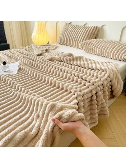 1pc Soft Vintage Style Faux Fur Blanket - Cozy Choice For Sofa And Chair, Striped Pattern, Machine Washable, Polyester Blend, Comfortable For All Seasons, Chair/Bed Cover | Soft Blanket | Polyester Blend, Rabbit Decor - Khaki - View 1
