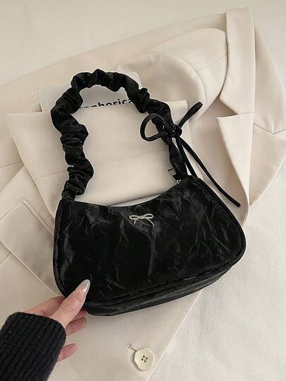 1pc Solid Color Fashion New Bow Tie Handbag, 2026 New Ladies Small Square Bag, Stylish Personalized Minimalist Pleated Shoulder Crossbody Bag - Black - View 10