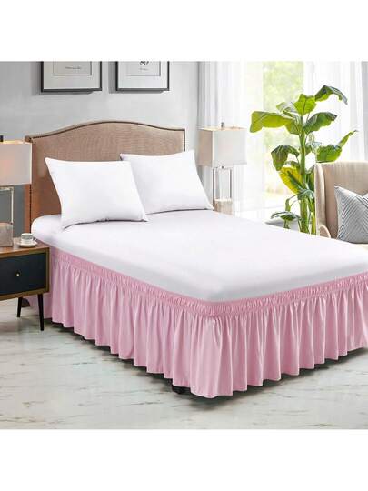 1pc Solid Color Stretchy Bed Skirt, Wrap Around Bed Skirt, Soft Bedding, Ruffle Lace Bed Skirt, Comfortable - Pink - View 1