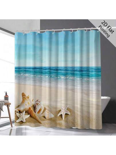 1pc Starfish & Seashell Pattern Digital Printing Mildew Resistant Waterproof Shower Curtain, 12 Plastic Hooks And Metal Grommets, Durable And Sturdy Bathroom Accessory - Multicolor - View 1