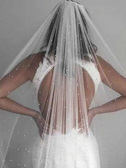 1pc Thin Tulle Pearl Single Layer Wedding Veil, Cathedral Length Bride Veil For Party, Women Fall Clothes For Women Valentine's Day Accessories - Ivory - View 1