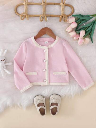 Stickad kofta för flickor, mjukrosa, rund halsringning med kontrastfärgade detaljer, modern och elegant. Kort modell med dekorativa knappar och fickor, som ger designelement till damvinterjackan. - Rosa - Visa 1