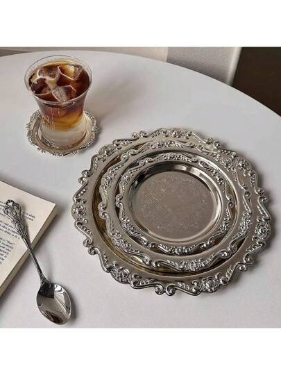 1pc Vintage Tray, Cup Coaster, Candle Holder, Jewelry Organizer Tray, Metal In Gold Or Silver Color - Silver - View 1