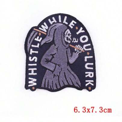 1pc Whistle While You Lurk Wizard Badge Embroidered Patch, Grey English Letter Embroidery Patch, Punk Style Denim Jacket Backpack Embroidered Patch, Halloween Party Window Curtain Decor - Skull Embroidery DIY Patch - View 1