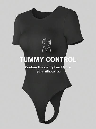 1 st Kvinnor Svart Seamless Scoop Neck Kortärmad Sexig Body Thong - Svart - Visa 1