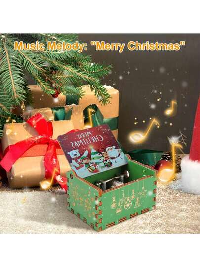 1pc Wooden Hand Cranked Christmas Music Box Small And Creative Music Box Decoration Suitable As A Gift For New Year,Christmas Party Birthdays - Multicolor 1 - View 1