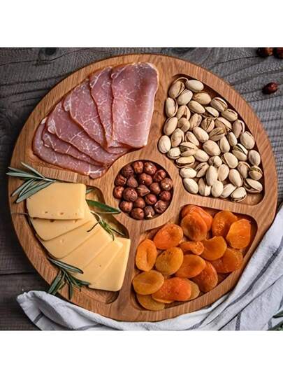 1pc Wooden Tray, Serving Platter, Cheese Board, 2/3/4/5 Compartment Food Tray, Round Barbecue Plate, Can Hold Meat, Cheese, Nuts And Fruits, Multi-Functional Fruit Tray, Creative Appetizer Snack Tray, Home Dessert Plate, Reusable Fruit Tray, Kitchen Decor, Kitchen Supplies, Wedding Candy Storage Tray - Yellow - View 18