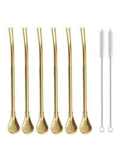 2/4/6pcs Stainless Steel Detachable Threaded Filtered Straws & 1/2 Cleaning Brushes, Suitable For Flower Tea, Juice Strainer & Kitchen Utensils, Afternoon Tea Gathering,School Supplies - Gold - View 1